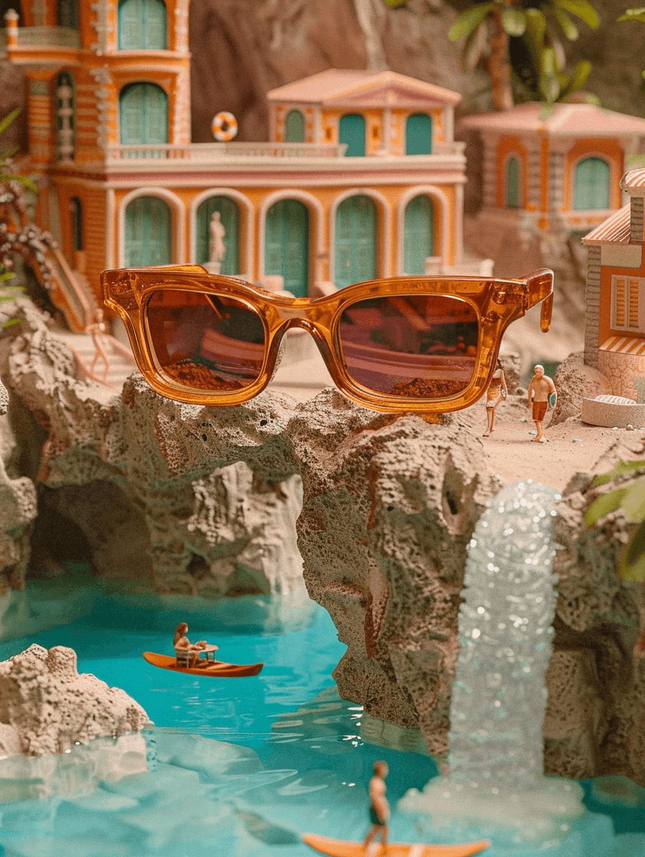 Creative composition, miniature landscape shooting, very American retro color, a huge pair of colored sunglasses placed in a summer beach miniature scene, miniature people and beach chairs, resort hotels, seaside, realism, color level, depth of field, high quality, ultra-fine details, shot by Hasselblad, –ar 3:4 –stylize 500 –chaos 20 –v 6.0
