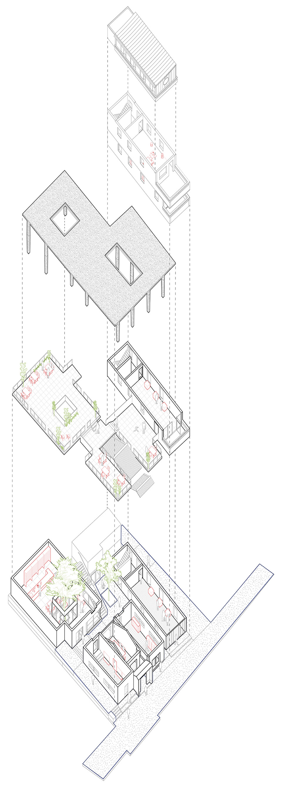 In terms of layout, the lands that belong to different owners are preserved to the maximum extent. Within the limited area, a series of alley spaces and an open central courtyard is created, which extends the original street pattern and achieves upward growth of the space.