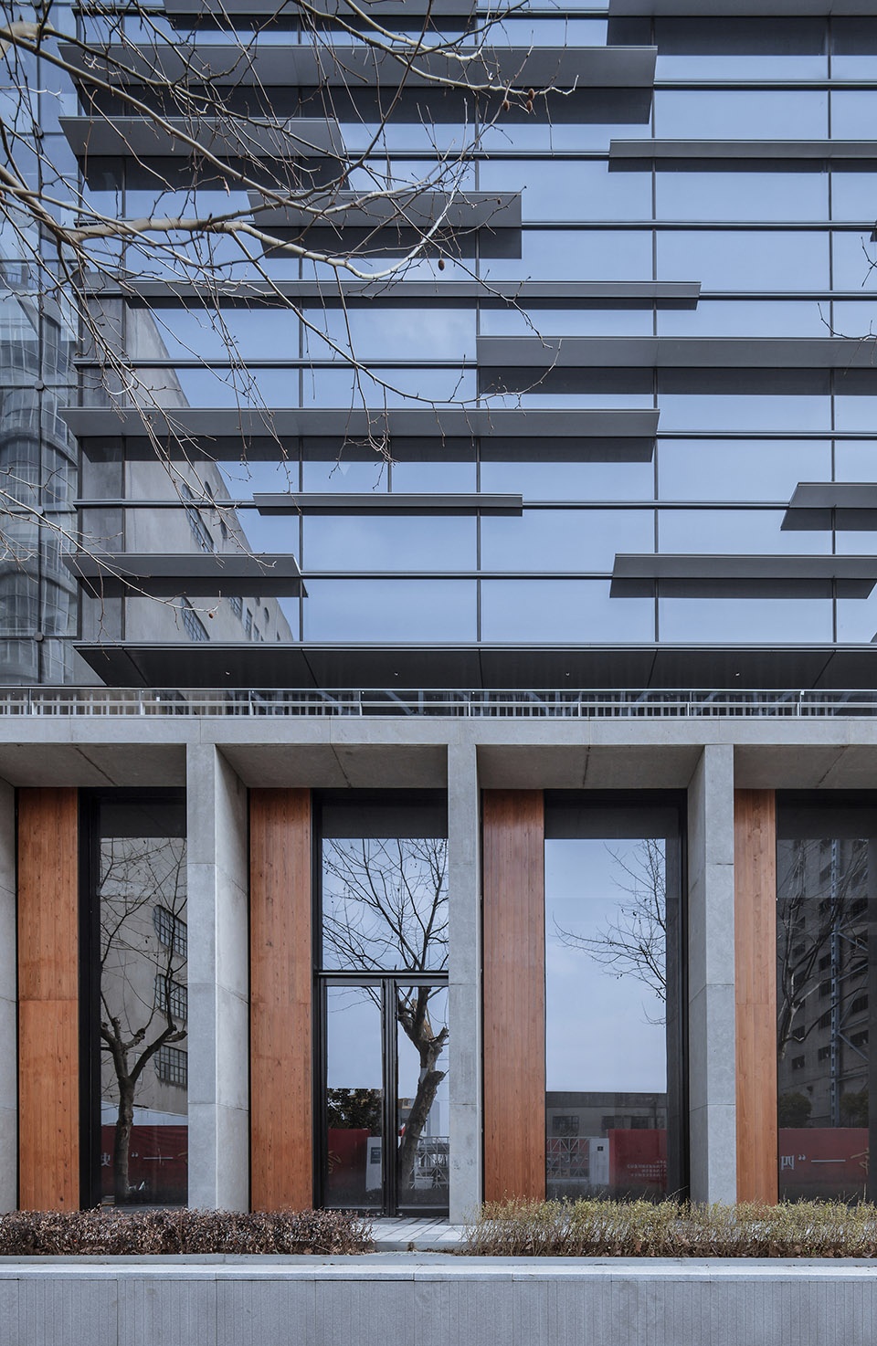 Unique from the traditional office building, Minsheng Wharf Block E15-3 selected Moroccan gray limestone and pressure-treated wood panel for podium base storefront facade, which is consistent to the concrete material palate of the silo; meanwhile, the vertical grooved line details on the tower façade adopted warm-tone material such as metal copper, which reflects the materiality of the surrounding historical building.