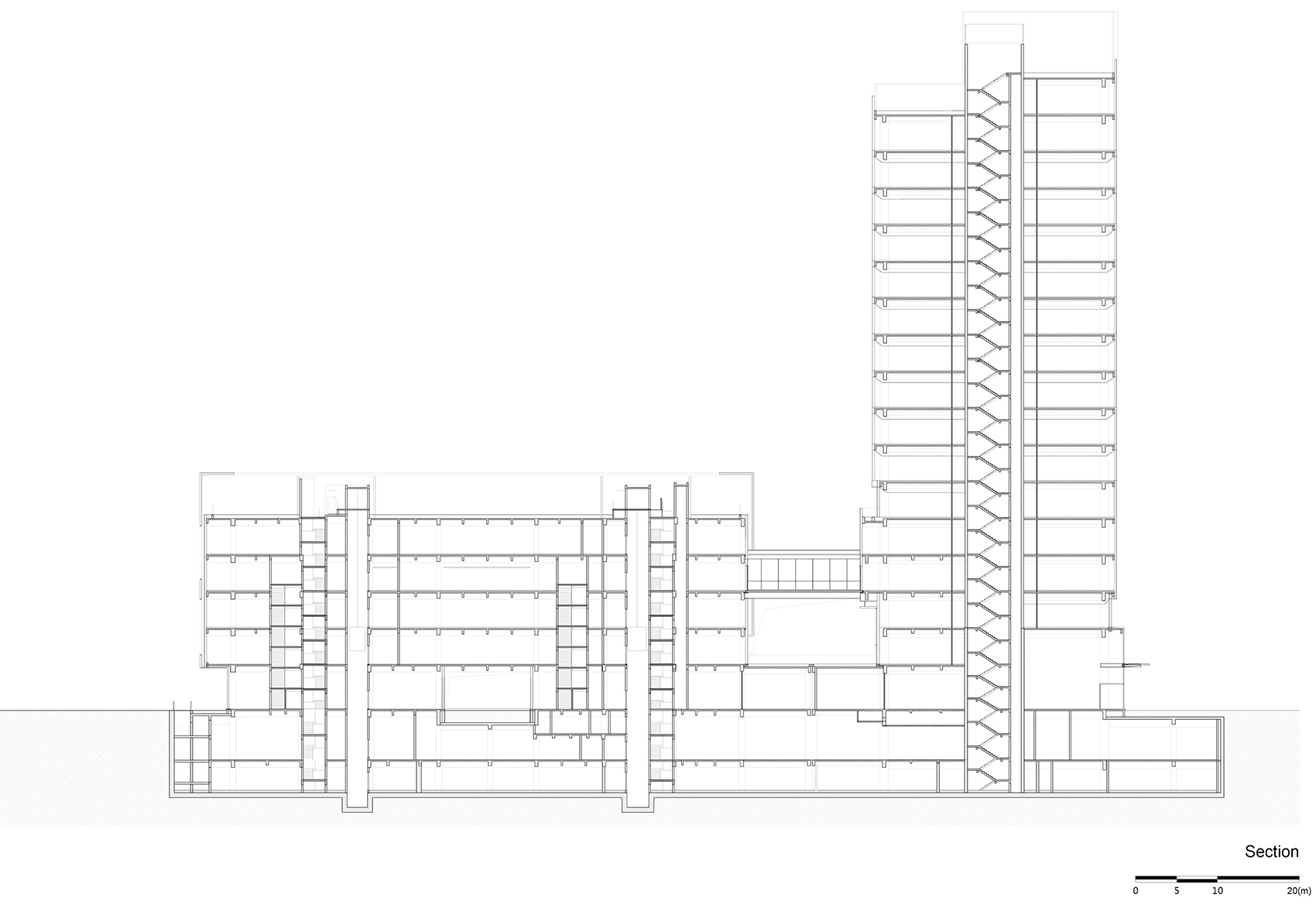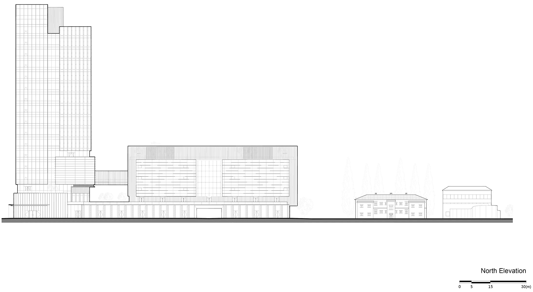 The superimposing of old industrial building and new architecture created a space-time dialogue with the waterfront sites. It’s a dialogue between the new and old, history and modernity, preserving and inheritance. Some design features are inspired by the surrounding heritage buildings in terms of scale and materiality, the tower and the podium are connected by a slender horizontal corridor, which not only facilitates the circulation in the building itself, but also pay tribute to the industrial elements of the silos on the wharf.