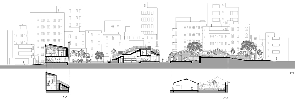 “Baode Square” is located at the centre of the old town’s main intersection. The plaza’s basketball court terrazzo floor was once the threshing venue of the Nantou Community in the 1970s. We persuaded the village to agree to have the two temporary tin commercial structures by the plaza transformed into a communal public area for activities. The two buildings’ new roofs will become viewing steps that descend to the sides of the plaza, integrating the architecture with its surroundings, yet still showing subtle differences. Together with the numerous windows, balconies and roofs of the surrounding residential building, the new architecture creates a three-dimensional urban theatre which invites locals to sit and hang out, enjoying the daily occurrence of colorful, lively urban drama.