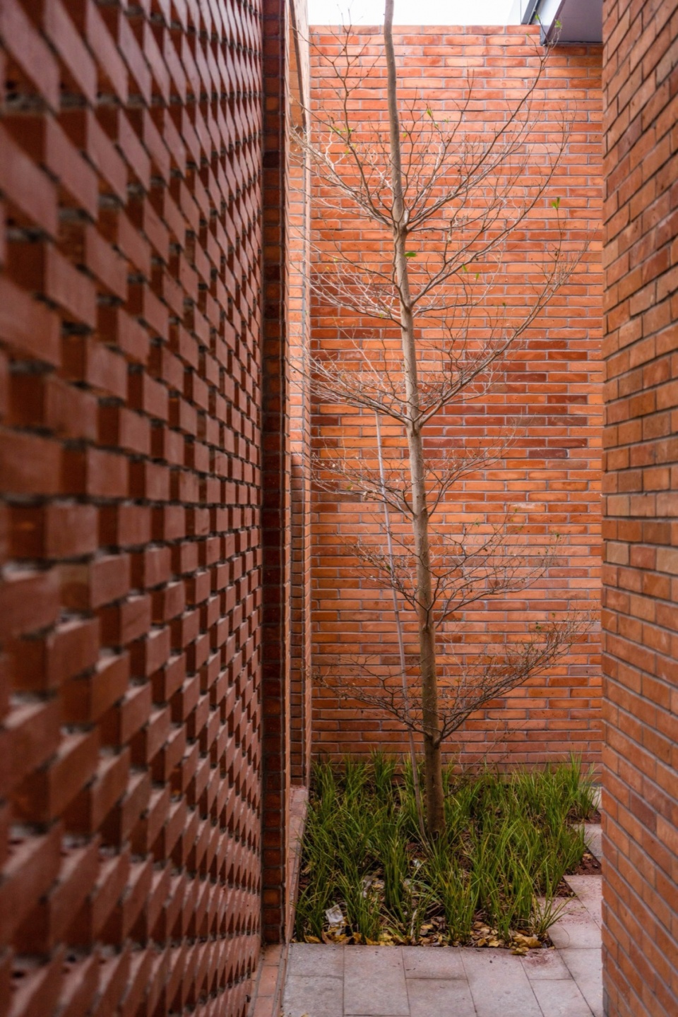 园区早期很多建筑是用红砖砌筑,结合岭南的独特气候,利用原始材料进行简单的镂空处理,方便排风和降温,也达到遮挡作用。结合老厂红砖历史元素,进行新的组合排列,以一条整体的红砖形成的连廊由东向西,整合项目场地,形成整体统一、完整、规范的空间动线。