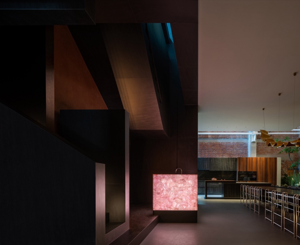 奢石材质的吧台,打上灯光,勾勒出硬朗的体块, 同时带来了灵动的漂浮感,氛围感时尚感立刻拉满。设计师这样说道:“在原本空旷的厂房中搭建出全新的室内建筑并非一件容易的事情,需要考量尺度比例、功能分区 、景观营造 、产品呈现 、艺术氛围等等因素”。在原本空旷的厂房中搭建出全新的室内建筑并非一件容易的事情,需要考量尺度比例、功能 分区 、景观营造 、产品呈现 、艺术氛围等等因素。空间设计的比例尺度是设计师文武十分注重的细节,西方空间的恢弘气势和中式古典的四平 八稳在这个艺术体验场中得以融合实现。有时候面对空间的「力量」也是一种治愈。这种力量不靠元素堆积灌输,而是通过氛围营造令人沉浸其中, 颇有「渺沧海之一粟」的通感。