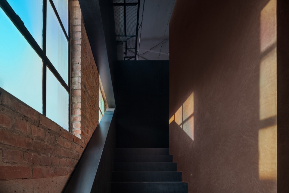 在楼梯间,我们可以清楚的看到设计师保留了原始厂房的墙体,裸露的墙砖与现代感十足的楼梯形成一种新与旧的「冲突」, 让旧的显得更旧,新的显得更新,两种气质互相加持,散 发出独特的光芒, 朴素的艺术气质也在新的环境之中重新焕发了生机。透过楼梯往下看, 又是一个不一样的空间感受, 行走间, 视角不断变换, 心情也随之不同。 彩色玻璃透过的光出现在空间的各个角落, 接受圣光的洗礼, 一切安静且祥和。